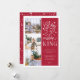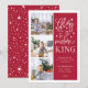 Belo cartão com fotos de Natal baseado em tipografia apresenta três das suas fotos favoritas em formato quadrado ao lado esquerdo. "Glória ao rei recém-nascido" aparece à direita em tipografia branca, escrita à mão sobre fundo vermelho vibrante, pontilhado com estrelas festivas. Personalize com sua saudação pessoal, nomes de família, nomes individuais e o ano. Cartões invertidos a um padrão de neve branca e estrelas em um plano de fundo correspondente.