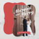 Uma saudação moderna de "Casado e Feliz" é a frente e o centro desta design que incorpora texto cursivo e tipografia química para um olhar adorável que certamente celebrará seu primeiro Natal como Sr. e Sra. Uma saudação contemporânea casual para enviar a família e amigos, este design incorpora uma faixa vermelha festiva para seu nome familiar personalizado.