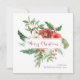 Elegante Greenery Feliz Cartão de Natal. Este belo cartão de Natal quadrado apresenta flores brancas e elegantes, cor d'água, vermelhas, com bagas ocas e verde sobre fundo branco, com um 'Feliz Natal' num elegante roteiro manuscrito | caligrafia. A parte traseira da placa inclui um padrão correspondente. Localize itens correspondentes na Coleção de Natal Botânico de inverno Vermelho Feriado.