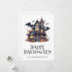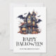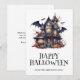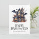 Belo cartão de Dia das Bruxas com uma casa assombrada, abóboras e morcegos. Personalize facilmente este cartão de Halloween com seu nome de família e texto.