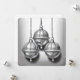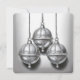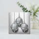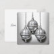 Um cartão de Natal minimalista com um desenho delicado de três sinos decorativos suspensos. No verso do cartão lê-se "Hark, How the Bells".