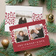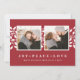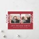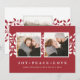 Cartão com fotos de feriado simples e elegante apresenta duas fotos quadradas favoritas em um fundo vermelho festivo com folhas e bagas brancas ocas. Personalize com um Natal ou cartões de natal (mostrado com "alegria, paz, amor") e seus nomes embaixo, em letras brancas clássicas. Adicione uma foto adicional ao verso, juntamente com o ano ou uma mensagem pessoal.