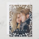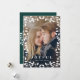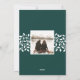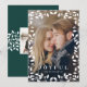 Um simples e elegante cartão com fotos de férias enquadra sua foto vertical com uma borda de folhas brancas e bagas. Personalize com um Natal ou cartões de natal (mostrado com "alegria") e seus nomes embaixo. Adicione uma foto adicional à parte de trás de um fundo verde escura de espuma escura com uma faixa de folhagem sagrada correspondente.