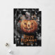 Feliz cartão de Dia das Bruxas com uma abóbora assustadora com folhas de outono em fundo preto. Personalize facilmente este cartão de Dia das Bruxas com seu nome e texto de família.