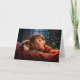 Este cartão de Natal adorável mostra um garotinho sorridente balançando com seu filhote perto da árvore de Natal na véspera de Natal. As palavras dentro dizem, "Que as simples alegrias da estação vos traga felicidade agora e sempre. Feliz Natal."