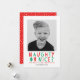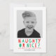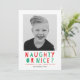 Mostre suas crianças boas ou travessosas favoritas com um cartão com fotos de feriado divertido e na moda. O Cartões de foto de Natal moderno apresenta as palavras "Naughty ou Nice" em um estilo de fonte tradicional, esquema de cores vermelho e verde e espaços reservados para sua foto e texto. A parte traseira apresenta um padrão vermelho e branco brilhante de pontos.