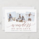 Elegante cartão com fotos de feriado religioso apresenta três fotos quadradas em um layout de colagem, com "maravilhas de seu amor" sobrepostas em um roteiro de tons suaves e em letra de bloco. Personalize com o(s) seu(s) nome(s) e o ano abaixo. Cartões invertendo para um fundo botânico vermelho e creme com padrão. Uma escolha moderna e minimalista para as saudações de Natal de 2021.