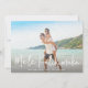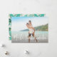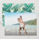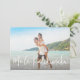 O cartão com fotos de cheio chic sangra horizontal ou orientado para a paisagem apresenta "Mele Kalikimaka", a saudação de Natal havaiana, em tipografia casual de guião com letra branca como uma sobreposição na sua praia ou fotografia de férias favorita. Personalize com sua mensagem de feriado personalizada, o ano e seu nome de família embaixo. Cartões invertendo o padrão das folhas de bananas tropicais.