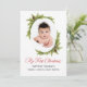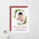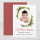 Comemore o primeiro Natal do bebê com um cartão de férias com uma foto favorita do bebê. Este design tem um quadro oval embelezado com pinheiros eververdes e cones de pínus com guião vermelho festivo Meu Primeiro texto de Natal. O verso da placa tem um padrão de harlequina vermelho e dourado coordenado. Personalize este cartão com a foto do seu filho. Você pode editar o texto do cartões de natal com o texto desejado e seus nomes.