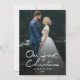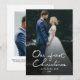 Este cartão de férias chic elegante e sem esforço é perfeito para recém-casados, para compartilhar a alegria das férias com a família e os amigos. O cartão apresenta "Our First Christmas" (Primeiro Natal) em uma bela fonte de folha prateada falso, escrita à mão, com espaço para uma grande foto na frente e mais uma foto na parte traseira. O cartão também contém saudações no verso. Personalize o cartão substituindo as fotos e o texto pelo seu. Entre em contato diretamente com o designer se você tiver uma solicitação de personalização de design.