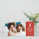 Este cartão de férias elegante apresenta uma silhueta de cabeça de cervo branca sobre um fundo vermelho e as palavras, "Oh, Deer! O Natal chegou!" O verso do cartão ostenta um padrão xadrez tartan em verde, vermelho, azul, amarelo, prata e branco.
