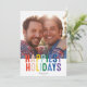 Este divertido cartão de fotos de feriado apresenta uma tipografia colorida sobre um fundo branco com uma única foto vertical. O cumprimento na frente diz "Boas Festas". Este design acomoda uma única foto vertical na frente do cartão. No verso, você encontrará um padrão festivo de listras diagonais vermelhas e brancas que pode ser removido ou personalizado. Você também pode adicionar outra foto ou texto ao verso selecionando "personalizar design ainda mais".