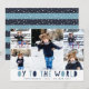 O cartão com fotos Whimsical Hanukkah apresenta cinco das suas fotos da família favoritas em uma colagem com o layout "Oy to the World" aparece embaixo da letra azul de recorte. Personalize com seu nome ou nomes de família, saudação personalizada e o ano na parte inferior. Cartões invertem para um padrão de neve branca em faixas azuis. Um cartão hanucá engraçado e moderno projetado para adicionar alegria alegre às suas mensagens de feriados.