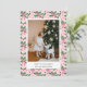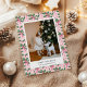 Cartão de férias com um fundo de papel de parede rosa e verde pastel com uma foto de família combinada com uma saudação de férias e seu nome e ano em uma fonte sem serifa.