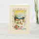 Cena de inverno de neve com uma mulher em um casaco vermelho puxando uma criança em um trenó através da neve. Há uma bela vista cênica de uma velha igreja e árvores nuas com céu azul e amarelo à distância. A imagem está enquadrada em um padrão de rolagem dourado e a saudação " Para desejar um Feliz Natal". **Imagem de um Natal vintage Cartão postal em um fundo creme personalizado (amarelo claro).