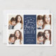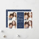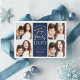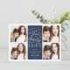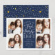 O cartão com fotos de Hanukkah, baseado em tipografia moderna, mostra quatro de suas fotos favoritas em formato quadrado, com "Peace, Love and Light" centrado em tipografia de estilo branco, escrita à mão. Personalize com seu nome de família, nomes individuais e/ou sua mensagem personalizada. Cartões invertidos a um padrão de neve branca e estrelas amarelas sobre um fundo azul marinho.