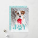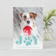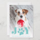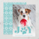 Cartão com fotos de feriado Whimsical apresenta uma foto favorita do seu cachorro com "JOY" como uma vibrante camada de texto em turquesa embaixo. Uma ilustração de pata doce substitui o "O". Personalize com sua saudação e nomes personalizados na parte inferior.
