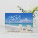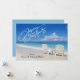 Desejos quentes de férias da praia. Em um roteiro branco diz: "Feliz Natal". Há um céu azul brilhante, um oceano e uma bela areia. O oceano com água azul de cristal está caindo ao longo da areia. Há duas cadeiras brancas perto da água. Veja as muitas outras cenas de praia e produtos que temos em nossa loja.