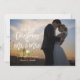 Cartão de férias moderno com as palavras "nosso primeiro Natal como Sr. & Sra." em uma fonte manuscrita moderna com sua foto exibida ao fundo. O verso do cartão apresenta flocos de neve com brilho prateado falso.