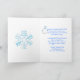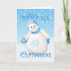 Pequeno bonitinho com mitenes azuis felpudos, chapéu e cachecol está sorrindo em uma neve suave de flocos de neve bonito no primeiro cartão de saudação de natal deste bebê. O verso dentro pode ser personalizado usando o modelo fornecido. Nos especializamos em designs feitos por medida, então entre em contato conosco se você quiser um layout feito por encomenda exclusivo usando este design de boneco de neve.