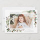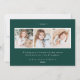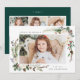 Cartão de férias elegante mostrando sua foto favorita na frente, emoldurada por buquês de flores de marfim, folhagem verde-luxuosa, cones de pinho e bagas sagradas. Personalize a frente da placa adicionando uma saudação personalizada e seu nome. O verso exibe mais 3 fotos com espaço para o ano, uma mensagem personalizada e os nomes de sua família em um fundo verde da floresta. Projetado para coordenar com a nossa coleção de férias do Winter Floral.