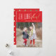 Este cartão de feriado caprichoso apresenta um sentimento divertido num guião de folha de ouro falso e lúdico num fundo vermelho ousado.