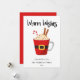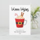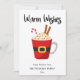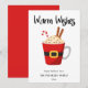 Queijos Quentes, Papais noeis ilustrados fofos temem a caneca vermelha de cacau quente com cana doce, bastões de canela, creme chicoteado e aspersores. Parte traseira dos recursos da placa, cor vermelha de coordenação sólida.
