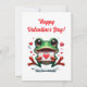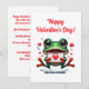 Uma rã verde brilhante e adorável sentada segurando um cartão do dia dos namorados, cercada por corações pequenos e fofos. As palavras “Feliz Dia dos Namorados!” estão escritas de forma divertida e com letras alegres acima da rã.