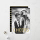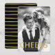 Comemore o Ano Novo com seus amigos e familiares enviando-lhes um cartão com fotos moderno de Ano Novo. O cartão com fotos apresenta a palavra "Cheer" em uma fonte de folha de ouro falso e espaços reservados para texto e foto. A parte traseira da placa apresenta um fundo preto com tiras desenhadas à mão de folha de ouro falsa. A cor preta pode ser alterada para uma cor de sua preferência com a ferramenta Personalizar.