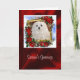 Este Cartão de Natal bonito apresenta o Snowdrop, um doce pequeno Cachorro Maltês. Sua imagem contém dentro a imagem dourada que é embelezada com flores vermelhas Poinsettia e verde.