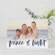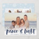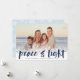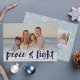 Cartões com fotos modernos de Chanucá apresentam sua imagem favorita com uma borda branca de flocos de neve ao longo da parte inferior. "Paz e luz" aparece na tipografia do pincel com letras marinhos azuis, com seus nomes e no ano abaixo. Personalize o floco de neve remodelado com três fotos adicionais e uma mensagem pessoal.