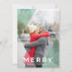 Comemore as férias com cartões com fotos de férias modernos e divertidos. Os cartões com fotos na moda apresentam um quadro de triângulo verde e branco puro, a palavra "feliz", o texto personalizado e um espaço reservado para fotos. A parte traseira apresenta um fundo branco com pontos verdes claros.
