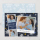 Cartão com fotos Chanucá bonito apresenta uma faixa de fotos com duas fotos e um painel de texto azul marinho, além de um instantâneo inspirado por câmera instantânea com uma legenda manuscrita. Personalize com o ano e seu nome de família ou mensagem personalizada, em um fundo azul marinho pontilhado com flocos de neve desenhados à mão e estrelas azuis e douradas.