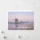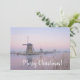 Cartão de Natal com envelope de um conto de fadas com moinhos de vento velhos à luz pastel macia de um nascer de sol de inverno com gelo no rio e geada nas sementes de uma manhã fria em Kinderdyke, Países Baixos, com o texto "Feliz Natal!".