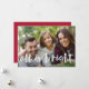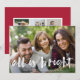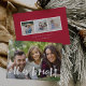 O cartão com fotos festivo apresenta sua foto favorita horizontal ou orientada a paisagem em cheio sangrado, com "tudo é brilhante" sobreposto em tipografia branca de pincel com letra branca. Personalize a frente do cartão com seus nomes e mensagens curtas de feriado (mostradas com "Feliz Natal"), e adicione três fotos adicionais no fundo de uma colagem em um fundo vermelho vibrante, junto com uma mensagem pessoal personalizada. Para um vazio de volta, simplesmente exclua os modelos de fotos e a camada branca matte.