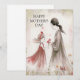 Uma ilustração encantadora de aquarela mostrando um momento delicado entre uma mãe e sua filha. A filha, vestindo um vestido vermelho fluido e uma faixa de cabeceira correspondente, oferece carinhosamente um pequeno buquê de flores vermelhas à sua mãe, que está vestida com um vestido de cinza gracioso. Cercado por elementos florais suaves e por um fundo pastel sonhador, este trabalho de arte captura lindamente o espírito do amor, da gratidão e as simples alegrias do Dia de as mães