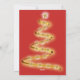 Uma imagem abstrato engraçada e fofa de uma cabeça de rena em ouro falso. Com Enfeites de natal, bolhas penduradas nas galhadas. Fundo vermelho clássico, Ouros, personalize e adicione seu texto e seu nome de família. Volta: uma abstrato brilhando árvore de Natal em ouro falso. Cor do fundo vermelho.