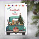 Um caminhão de picape azul teal carregar uma árvore de Natal decorada e pacotes de presentes na frente deste cartão de Natal bonito. Um cão de Vizsla vermelho olha pelo porta-malas. Um cartaz de madeira rústico na pára-choque diz "Feliz Natal". Na parte superior do cartão está uma série de luzes de Férias, e texto personalizado que diz atualmente "Da nossa casa para a sua". O dentro da placa tem mais campos de texto para personalização.