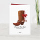 Cartão de saudação de Natal estilo diverso, feito em um papel antigo e texto vermelho personalizado ousado. Gráficos de uma bota marrom de cowboy são todos decorados festivamente com um tique de holly e uma bengala vermelha e branca de doces. Personalize este cartão de feriado exclusivo para ler o que você quer.