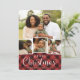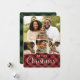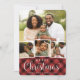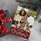 Cartão com fotos festivo apresenta quatro de suas imagens favoritas organizadas em um layout de colagem. "Feliz Natal" aparece debaixo de letras brancas num fundo de xadrez de búfalos pintado à mão rústica em vermelho e preto. Personalize com seus nomes e o ano.