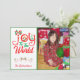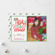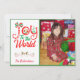 Envie este cartão de foto de férias brilhante e colorido para seus amigos e familiares e coloque um sorriso no rosto deles! O design apresenta uma tipografia que diz "Joy to the world" e a palavra Joy é decorada festivamente em vermelho, dourado e verde com enfeites, laço e árvore de Natal. Envie sua foto favorita da família ou da criança e personalize com seu nome e pronto! O verso do cartão tem um padrão de bastão de doces em purpurina (falso) cintilante. Muitos outros designs na minha loja em www.zazzle.com/digiscrapthat