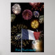 O Drapeau Tricolore francês no meio de uma exibição de fogos de artifício do dia da Bastilha.