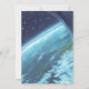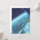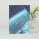 Ilustração vintage futurista do espaço e planetas. Imagem de ficção científica que apresenta uma vista do planeta Terra a partir da janela de uma nave espacial. Você pode ver nuvens a rodopiar sobre a terra e o oceano azul. Acima do horizonte está o céu noturno com estrelas a brilhar intensamente. Um design clássico de banda desenhada de ficção científica retrô dos anos 50.