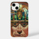 Ilustração retrô futurista de ficção científica de alienígenas e robôs com um homem com o cérebro exposto em um laboratório. Um design clássico de história em quadrinhos com um cientista ciborgue com a mão no queixo com uma expressão intensa no rosto e parece estar pensando no futuro ou talvez apenas perdido em pensamentos.