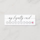 Cartão punch de fidelidade na moda com "meu cartão de fidelidade" escrito em caligrafia delicada. Para um desconto na décima visita, com um coração rosa quente como marcador.