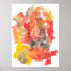 O final do verão apresenta cores quentes e solares de vermelho, laranja e amarelo em aquarela, com acentos de lápis e lápis de giz.