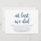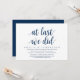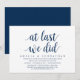 Roteiro moderno em tema azul navy sofisticado, cartão de convite de casamento furtivo (Finalmente, nós fizemos). É perfeito para o seu jantar de casamento furtivo casual à beira do lago, dança e festa.