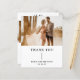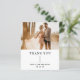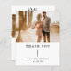 Cartões de agradecimentos de casamento com estilo contemporâneo e moderno, apresentando um design simples e mínimo com "Obrigado" junto com seus nomes e data de casamento em letras negrito abaixo de sua foto favorita. O verso tem uma segunda imagem, seu monograma inicial e sua mensagem personalizada. Esse cartões de agradecimentos de casamento tipográfico preto e branco minimalista pode ser personalizado para qualquer cor que você escolher na ferramenta de edição de design.