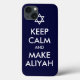 Apresenta texto lendo "MANTENHA CALMA E FAÇA ALIYAH." Aliyah (ע ל י ה), que significa sotaque, é a palavra hebraica para a imigração da diáspora para Israel. Aliyah é considerada como "subindo" na direção de Jerusalém. O que você está esperando?