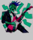 Um esqueleto robótico com um mohawk azul estilo punk toca uma guitarra elétrica rosa brilhante que emite ondas de energia elétrica quando tocado. o robô veste uma jaqueta de couro preto.